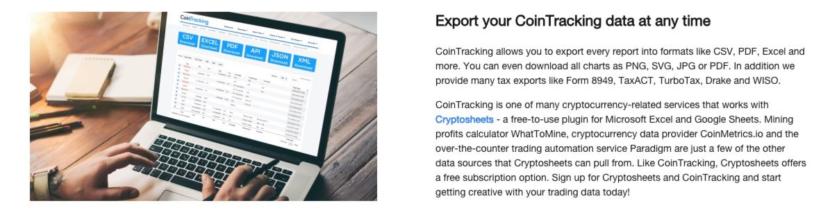 Export Data and Charts in Multiple Formats Such as CSV, PDF, Excel, PNG, SVG, or JPG. Image via CoinTrackingIn almost every category measured, CoinTracking either takes the win or is among the top performers. When you average out the strengths and weaknesses across multiple categories, CoinTracking and Crypto Tax Calculator are superior in most regards with CoinTracking edging out a win for us, thanks to their top-of-the-industry reporting and analytics and their price cannot be beaten for the services on offer.