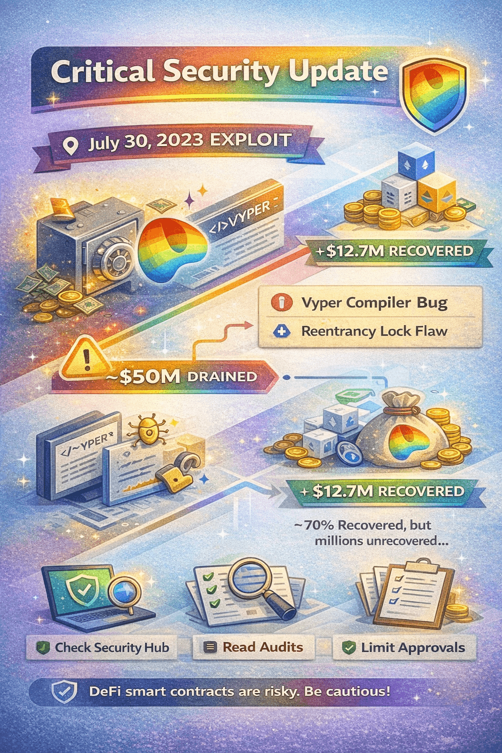 On July 30, 2023, several Curve pools were exploited in an incident widely reported as about $50 million drained ($70 million according to Chainalysis). A key detail: the root cause wasn’t “Curve math” breaking, but was a Vyper compiler issue affecting certain contracts compiled with vulnerable versions.