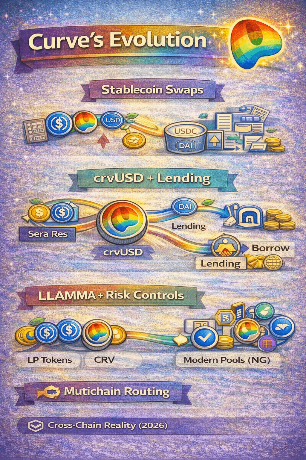 In plain terms: Curve moved from “a place you swap stablecoins” to “a system that can also create credit (loans) and a native stablecoin,” with swaps, borrowing, and liquidity incentives feeding into one another.