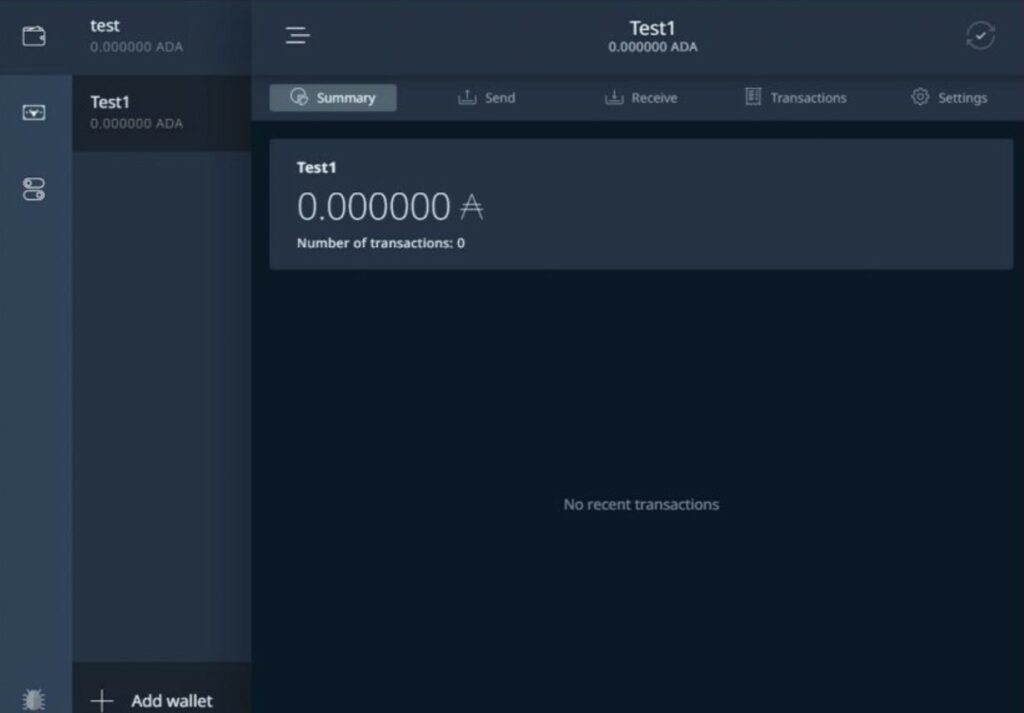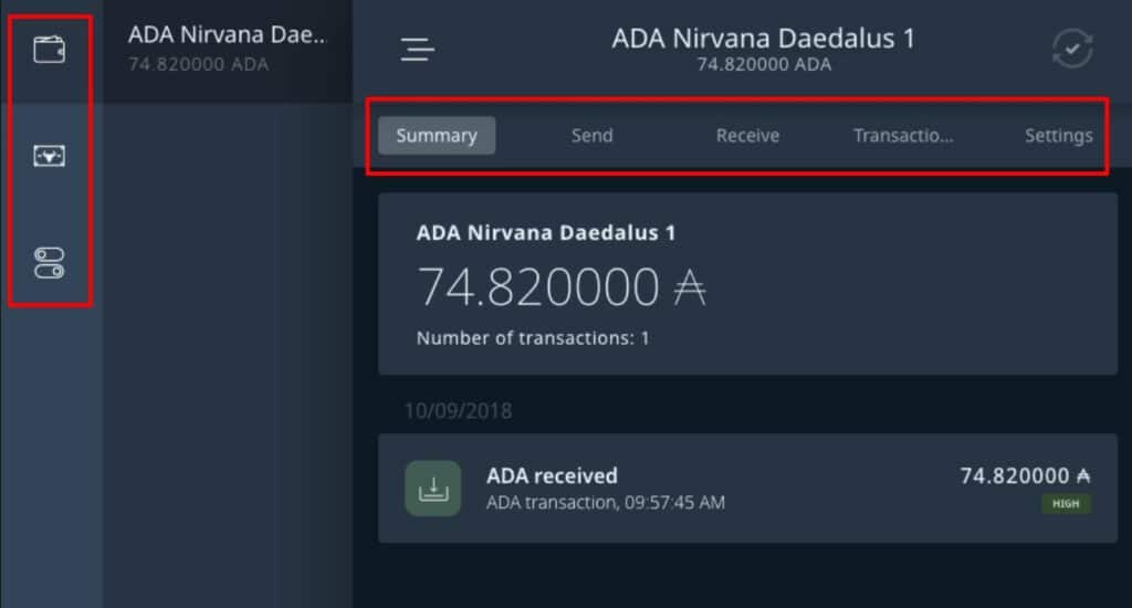 Upon first opening the wallet, you will see the wallet landing page which shows the amount of ADA you have, as well as the basic functions of the wallet. These are displayed along the top and have options for sending and receiving, transaction history, and settings.