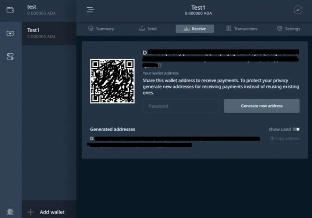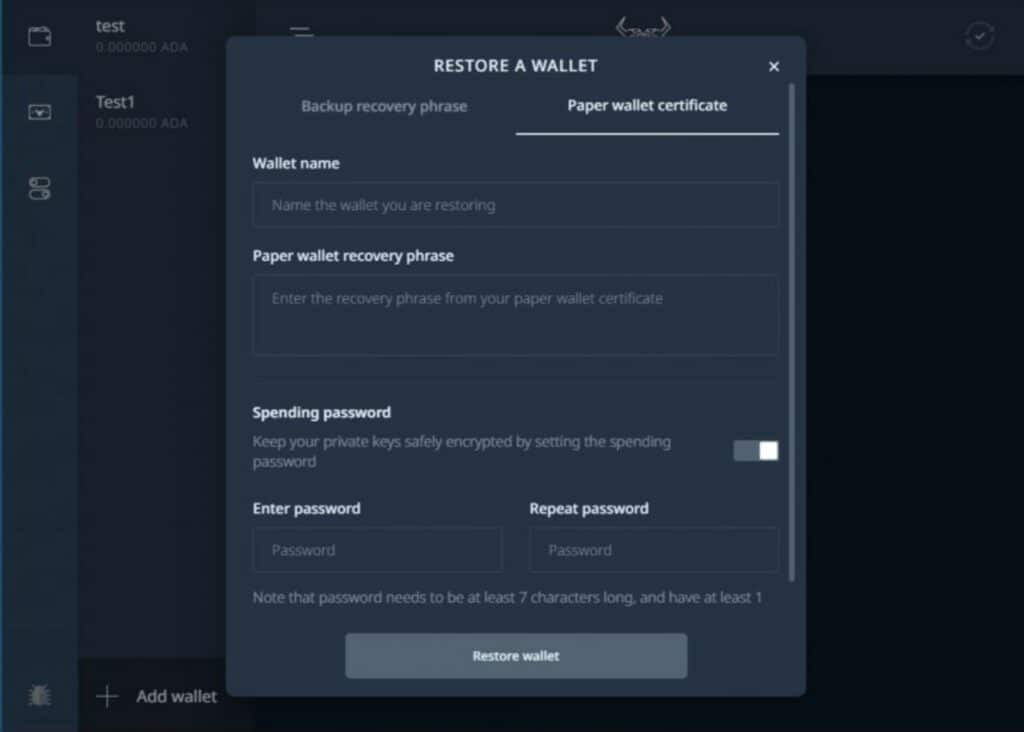 Image via IOHKThere is also an option to upload ADA under the “ADA redemption” tab. Here users can upload a certificate or paste in a redemption key to show any ADA that may have been purchased via other avenues. Users can also redeem paper vended and force vented ADA into the wallet.