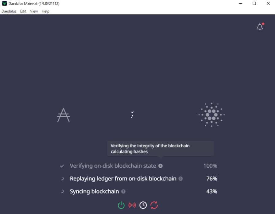 A Look at the First Setup Screen.Next, as Daedalus is a full-node wallet, you must allow it to synchronize with the Cardano Blockchain. This can take quite a bit of time, just kick back and let it do its thing.