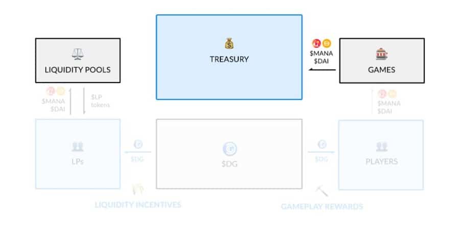 Relationships between various components of the Decentral Games ecosystem. Image via Decentral Games docs This provides the necessary capital for the treasury to function effectively, and also provides users with one means of generating income in the form of DG tokens. In short, the treasury incentivizes users to provide the necessary liquidity that ensures it is always able to pay out on winning wagers in the casinos.