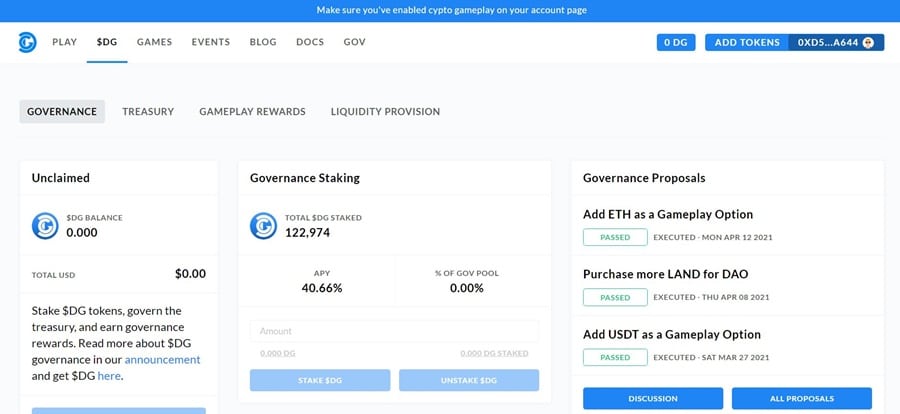 DG is the ticker symbol for the native cryptocurrency used to power everything from governance to mining rewards on the Decentral Games platform. It is an ERC-20 token and has no value or use outside the Decentral Games platform. As the primary utility token of the network holders are able to use DG to propose and vote on governance proposals, to stake and be rewarded with additional DG tokens, and to provide liquidity for the platform.