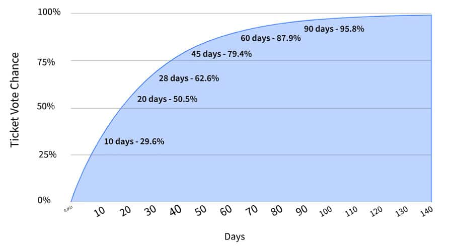 Decred Inflation Schedule. Image sourceDecred is designed such that the likelihood of receiving a staking reward increases over time, starting close to zero percent in the first few days, increasing to 50% after 28 days, and eventually to 99.5% after 160 days.