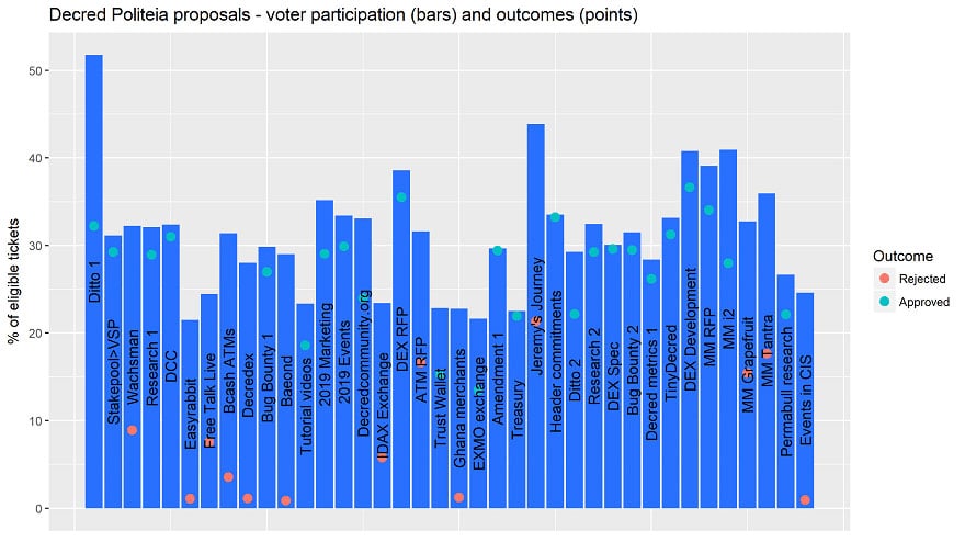 Decred Politeia Proposals & Participation. Image sourceAfter a vote is cast, the amount of DCR initially used to purchase the ticket is returned to the user plus a small reward. If the community votes in favor of the proposal, the development funds are issued manually from the Decred Treasury to the developers who implement the change. The primary development contractor for Decred is of course Company 0.