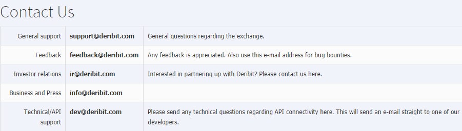 Email addresses used to contact DeribitGiven that they do not require you to verify your exchange, you do not have to wait on them to examine any documents like they do at numerous other fiat exchanges. These were often the slowest processes at these exchanges.