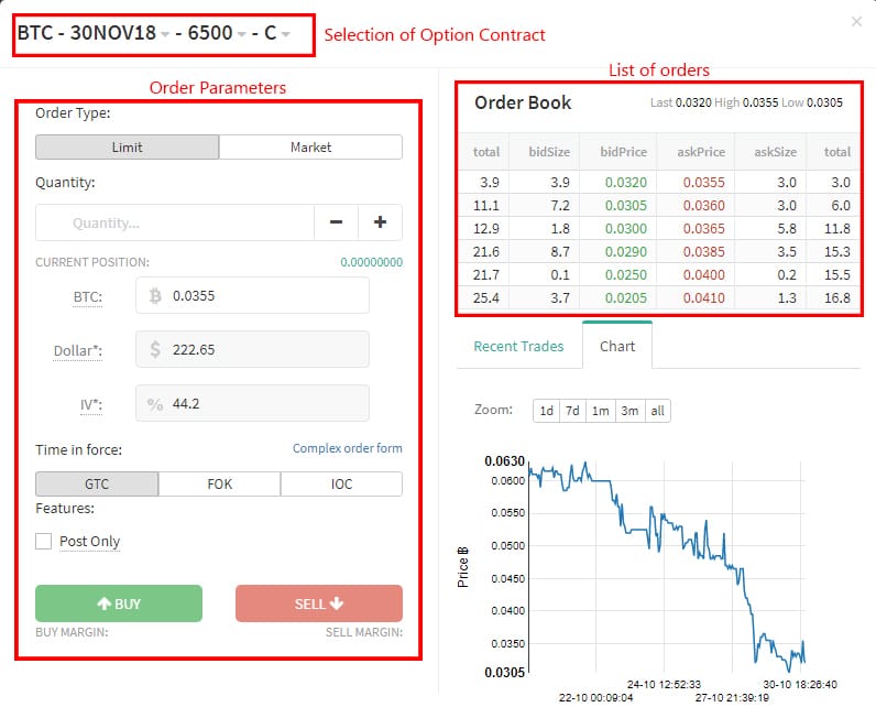 When it comes to option orders, you have most of the same parameters (except for the stop orders). What is unique about the option order form is that in addition to BTC and dollar value, you also have the Implied Volatility (IV) of the option.