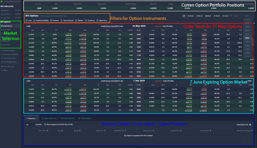 The Deribit Option Exchange User InterfaceIn the platform above are the order books for the 31 May 2019 and the 7 June 2019 option markets. As you can see, there is a plethora of information that you can glean from the Deribit option platform.
