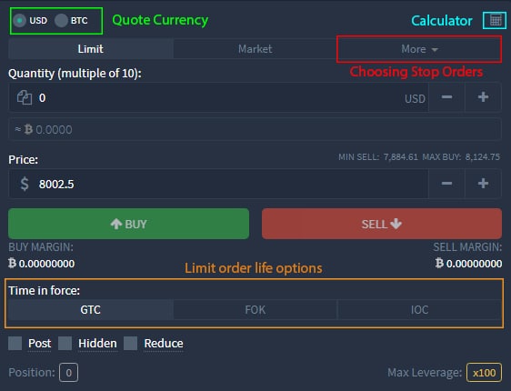 Deribit Futures Order FormThe first thing that you will notice is that you can refine the order form to either be denominated in USD or in BTC. This is unique to Deribit and allows beginner traders to assess margin levels in USD.