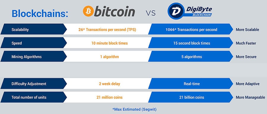 Benefits of DigibyteWhen compared with Ethereum, Digibyte also offers a blockchain where decentralized applications (dApps) can be created, as well as a native currency (DGB). Unlike Ethereum Digibyte offers the world massive on-chain scalability, and one of the fastest blockchains in the world, with the ability to process 2,000 transactions per second.