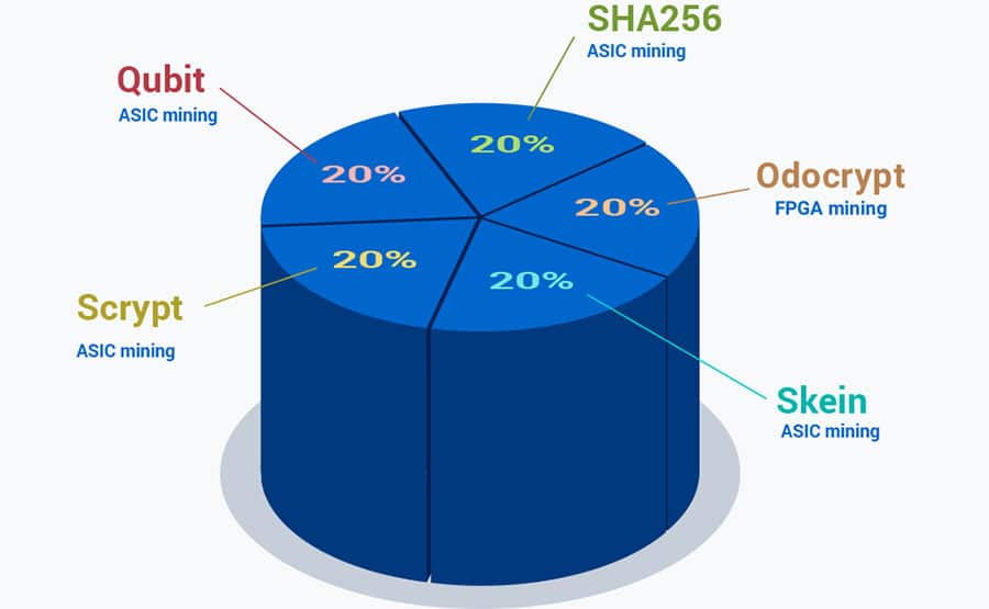 Digibyte was created as a Proof-of-Work blockchain and in September 2014 it was forked to add a characteristic called MultiAlgo which allows for mining with five different cryptographic algorithms. The five algorithms used are Sha256, Scrypt, Skein, Qubit and Odocrypt.