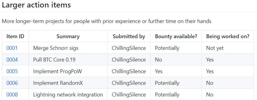 Items currently being worked on as of May 2020 include the ProgPoW algorithm to support GPU mining, and Dividends for DigiAssets.