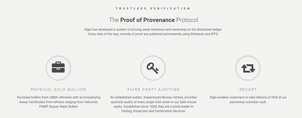 The consensus mechanism used for the DGX token will be a Proof of Provenance (PoP) system. In this system each gold bar will have its information recorded on the Ethereum blockchain. The information will include the time it was created, the serial number, its custody history, and the fees associated with it.