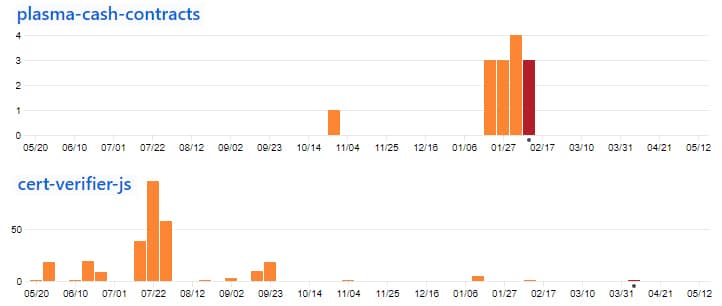 GitHub Commits in the past 12 monthsAs you can see, there is not that much activity in these repos. The last public commit to their plasma Cash repo was back in February. The rest of the 12 remaining repos are similarly barren.