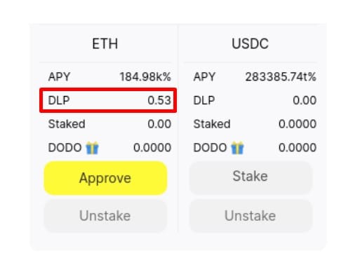 Image via dodoex.io- Click on the “Approve” button, and because ETH was deposited into the liquidity pool, you will now have the ETH DLP token for the ETH-USDC trading pair.