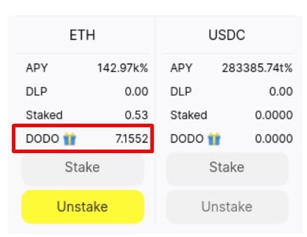 DODO can be unstaked at any time by clicking the ‘Unstake” button.