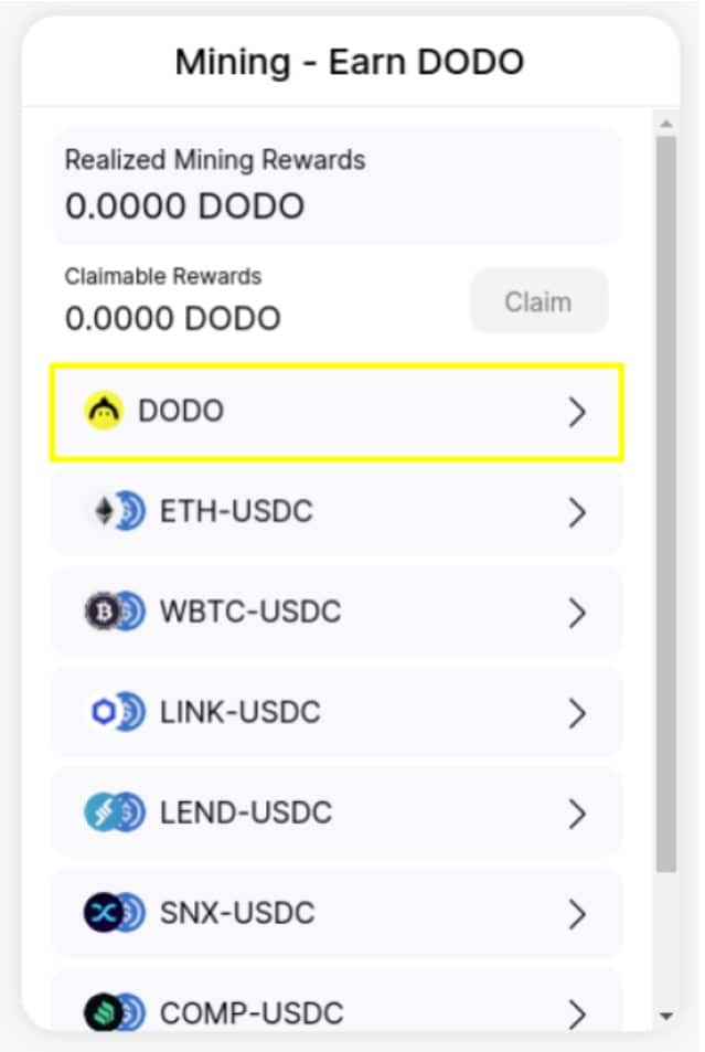 - Click on the first tab, “DODO”, there you will see the following screen, consisting of the balance of your realized mining rewards, your claimable rewards, and a list of options: