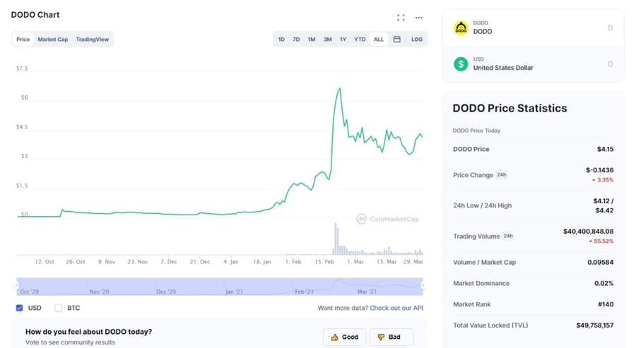 DODO tokens have participated in the 2021 rally in cryptocurrencies, hitting an all-time high of $8.51 on February 20, 2021. Since then the price has declined by over 50% and as of March 30, 2021 the DODO token is trading at $4.15. Given the volatile nature of the crypto markets and smaller tokens like DODO (it is ranked #140 in terms of market cap) it is impossible to predict if the value of the token will hold at its current value, rise again to take on the all-time high, or decline to lower levels.