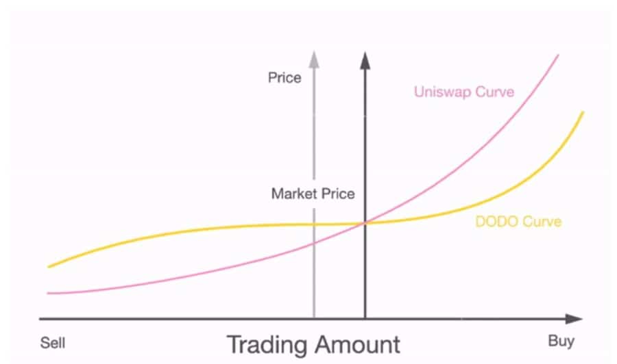 A more efficient liquidity curve. Image via DODO whitepaper. This model decreases the liquidity away from the market price very rapidly, removing the arbitrage opportunities and providing a more efficient exchange system when compared with AMM exchanges.