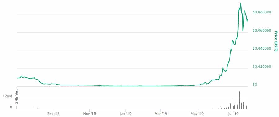 But it has captured many trader’s attention recently as it has skyrocketed into the top 50 on the CMC rankings. This is on the back of a price rally that saw it go from below $0.0001 in April 2019 to highs above $0.08 in July 2019.