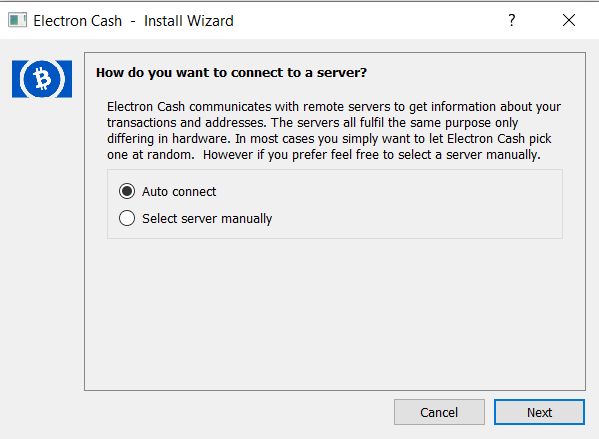 Electron Cash will present you with the option to allow it to automatically choose a server and connect, or to manually select a server. In most cases you will want to let Electron Cash select the servers automatically and at random.