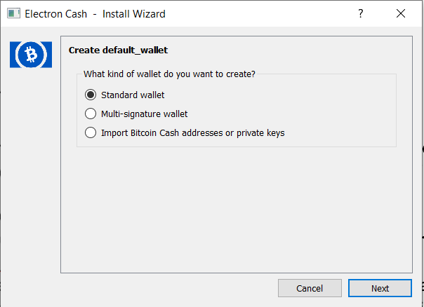 On the next step you will be asked what type of wallet you would like to set up. If you want a simple Bitcoin Cash wallet then you can select "Standard Wallet". Alternatively, if you would like to split the signing amoung two parties then you can choose "multisignature".