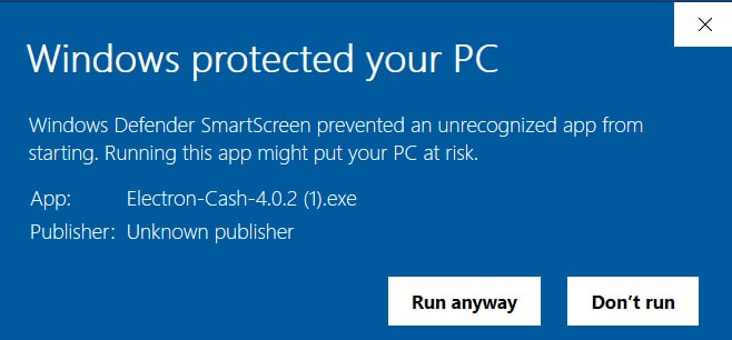 When you click the link it will ask you if you want to Run or Save (or Cancel). Go ahead and click “Run”. If Windows Defender flags the program this is probably because the Electron Cash developer is not known to Windows.
