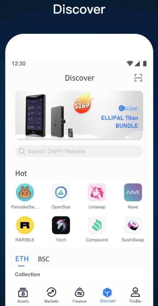 The ELLIPAL Titan Mini supports wallet connect, which is a platform that connects wallets with DApps, giving ELLIPAL users the ability to interact with popular third-party DeFi and crypto platforms.