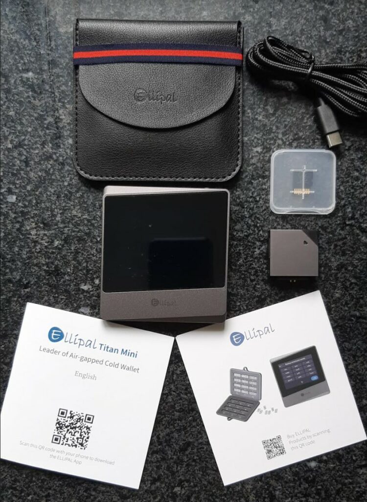 The ELLIPAL Titan Mini package comes with a USB charging cable and charging block that connects via magnets, a guide, a warranty card, a protective case, cards for writing down the backup seed phrase, and a micro-SD card for updating the firmware on the device.