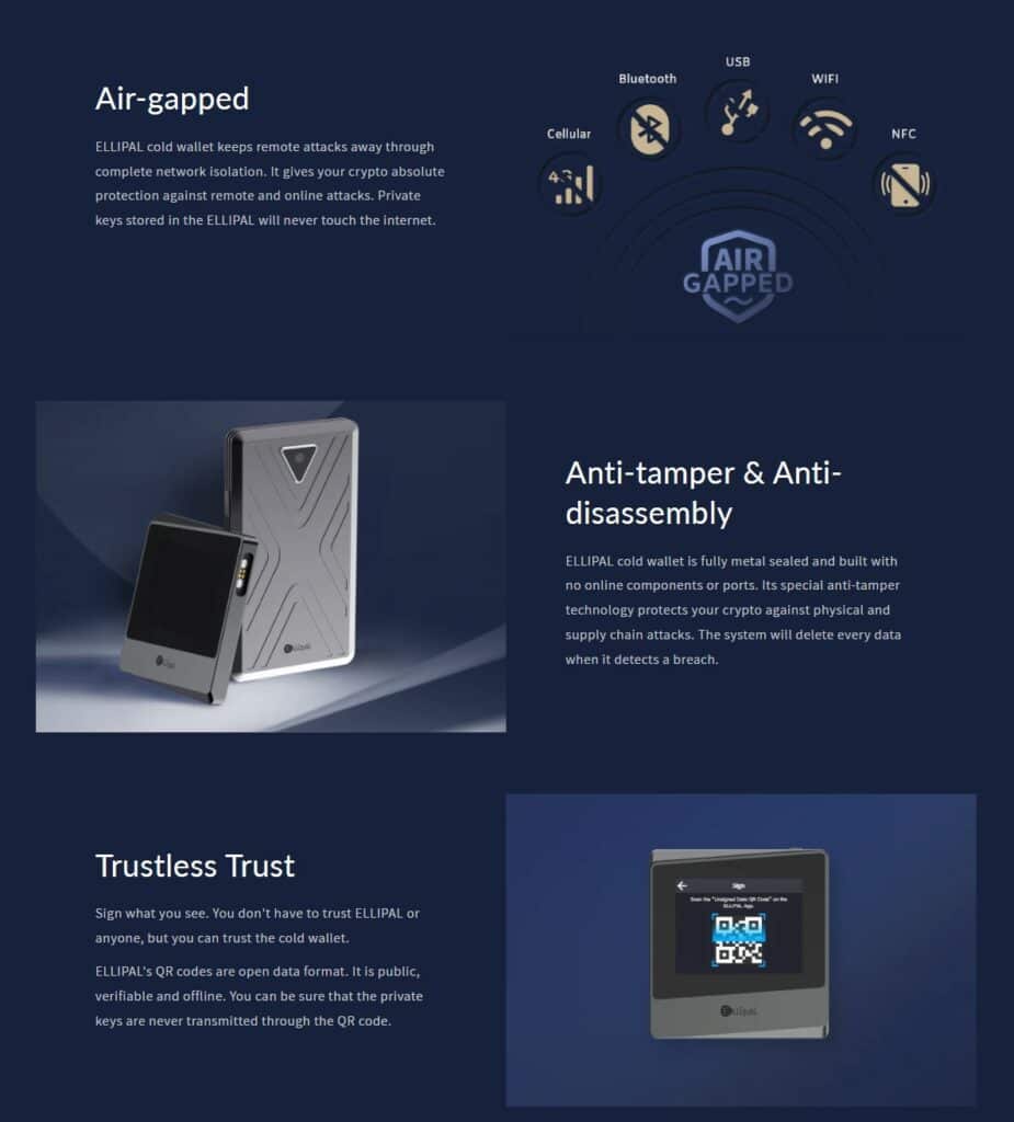 Some of ELLIPAL's FeaturesELLIPAL were the first movers in creating air-gapped cold wallets that use QR code communication technology to ensure that the wallet remains completely offline, even during transactions, unlike many other wallets that need to be connected via USB cables or Bluetooth. Here is a great article from ELLIPAL where they explain the benefits of using air-gapped wallets.