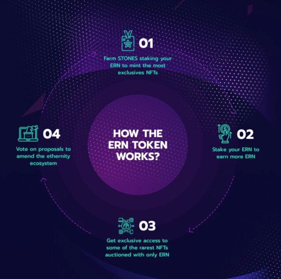 This cycle produces a deflationary token environment in which the circulating supply of the ERN Token is directly correlated to the number of NFTs sold on the platform.