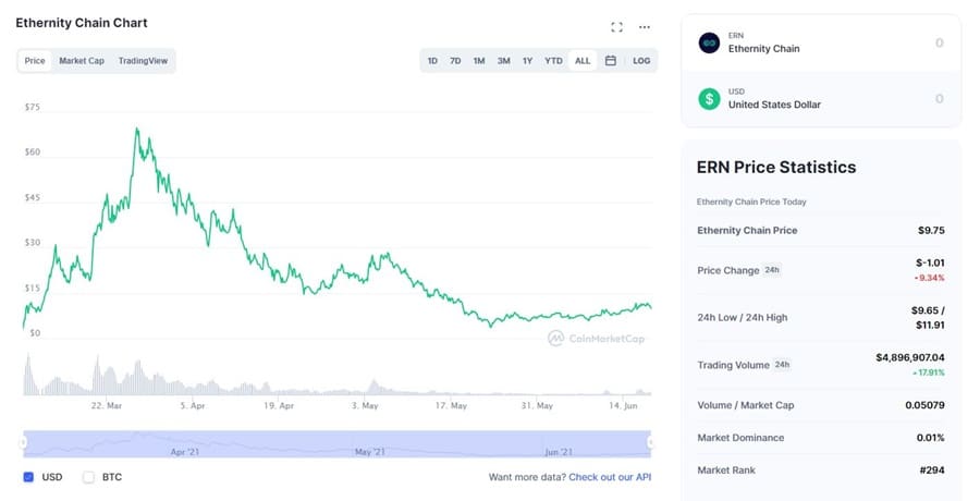 ERN is well off its all-time highs. Image via Coinmarketcap.com The token provides liquidity to ERN pools and allows users to farm unique authenticated NFTs which can be traded just like other cryptocurrencies. Participants can use ERN to purchase a-NFTs and take part in staking programs. Moreover, ERN is used for governance rights and it allows token holders to vote on key changes to the Ethernity platform.