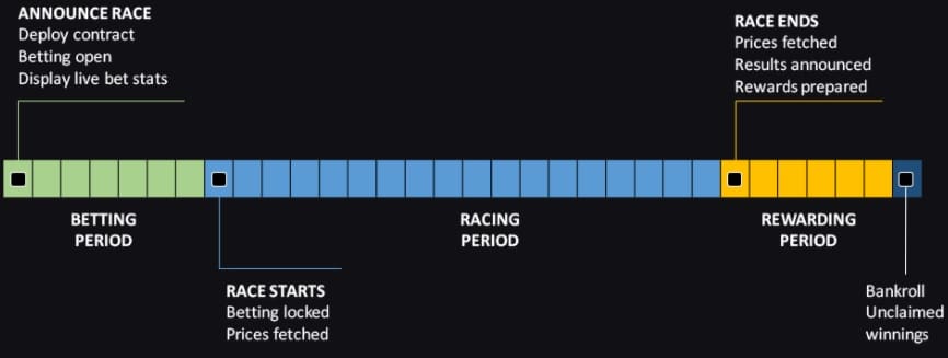 In this case, horse race betting is applied to a grouping of cryptocurrencies, such that people can bet on which one will perform best over a set period of time.