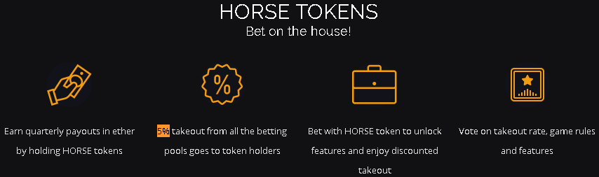 Overview of HORSE TokensAdditionally, those who hold HORSE tokens are able to vote on different features of the games or races, and thus have a say in Ethorse’s development. So yes, HORSE tokens can be valuable and useful, though you shouldn’t mistake them directly for the cryptocurrency you can win in a successful Ethorse bet.