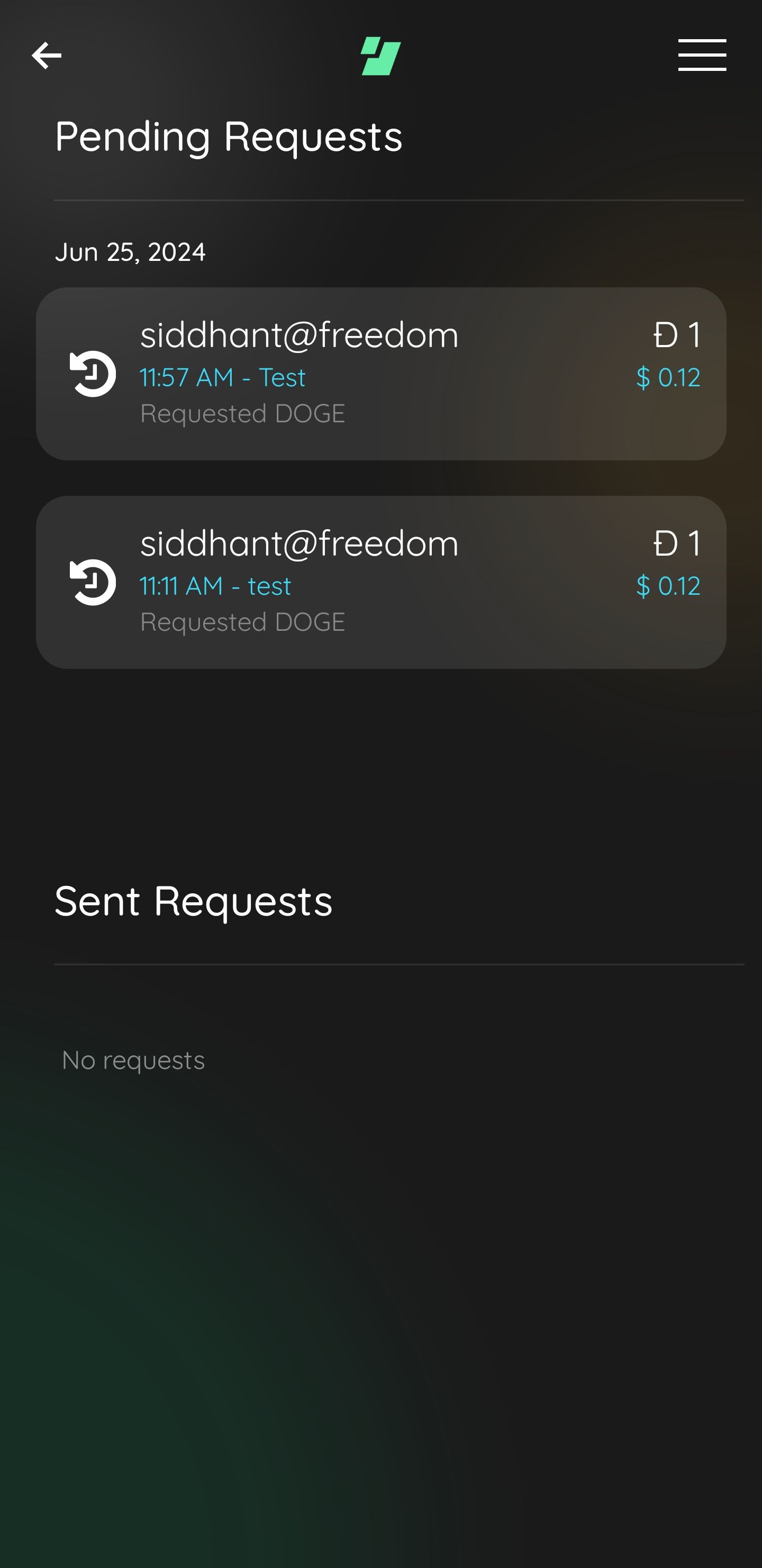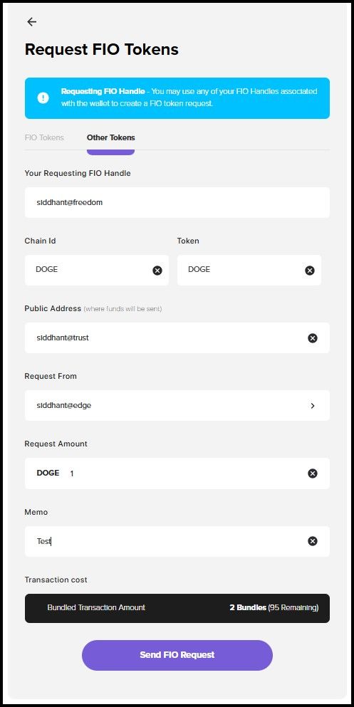 Requests Feature on the FIO AppSending requests on FIO is more efficient. All you need is the payer's FIO Handle, and there is no need to deal with public addresses at any point during the whole process. Using the FIO App, users can send payment requests, where they fill in the payer and payee Handles and specify the token and the amount. The request is sent on the FIO Chain and will be visible as an alert on the payer's wallet app.