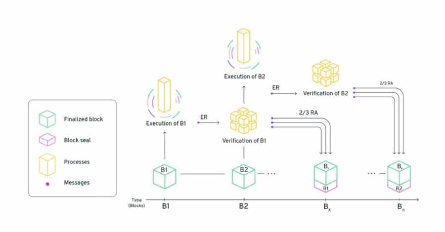 - A novel, four-node architecture that allows for improvements in speed and throughput without sharding, layer two solutions, or compromising decentralization.