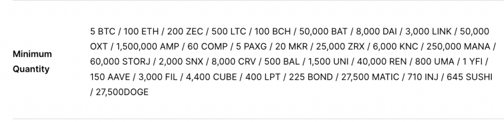 Placing large orders can affect the market price. This is due to the liquidity available on the order books, which may or may not be able to absorb the requested amount. As a result, you might also get quite a bit of slippage in the order. Gemini allows you to place these orders via the Block Trade function, a bit like OTC orders to prevent this from happening. To qualify for a block trade order, here are the minimum amounts required: