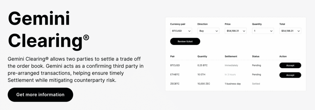 Another unique feature of the Gemini platform is Gemini Clearing. This feature allows two parties to basically trade with each other directly with Gemini acting as the trusted third-party. Neither of the trading parties know about each other. Their details are only known to Gemini.