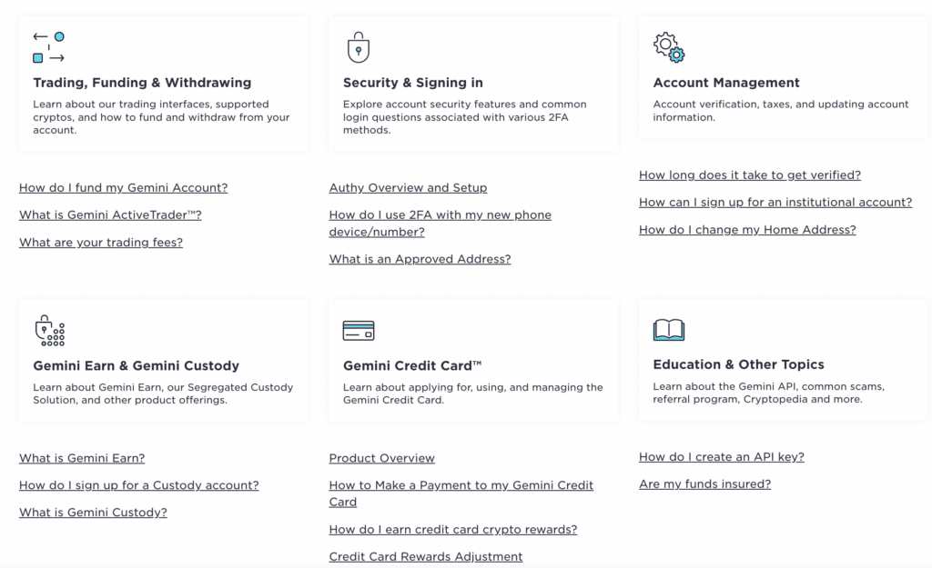 Find what you're looking for with these categories. I like that there is an Education section allowing users to learn more about crypto besides the Gemini products. The more people know, the savvier they get, which will help them make better investment decisions. If all else fails, there's still the option to chat with someone, although you'd need to first prove that the bot can't help you at all before you get passed to a real person.