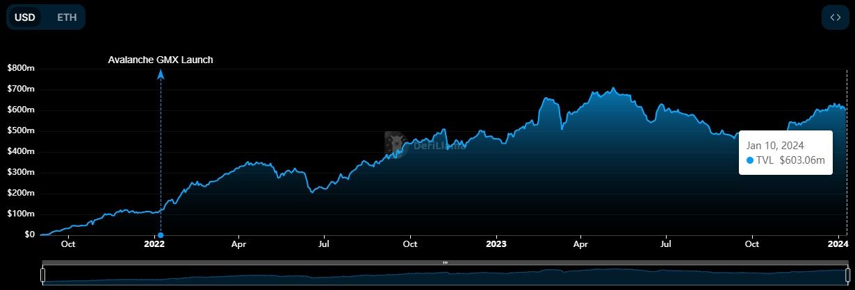 GMX's TVL stood at $603.1 million as of Jan. 10.