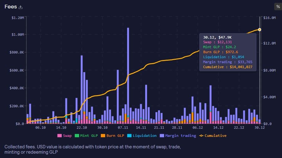 Fees on GMX Arbitrum Have Totaled $14 million In Q4. Image via GMXTurning to pool composition, GMX Arbitrum supports USDCe, USDT, UNI, LINK, DAI, USDC, ETH, BTC, FRAX and MIM.
