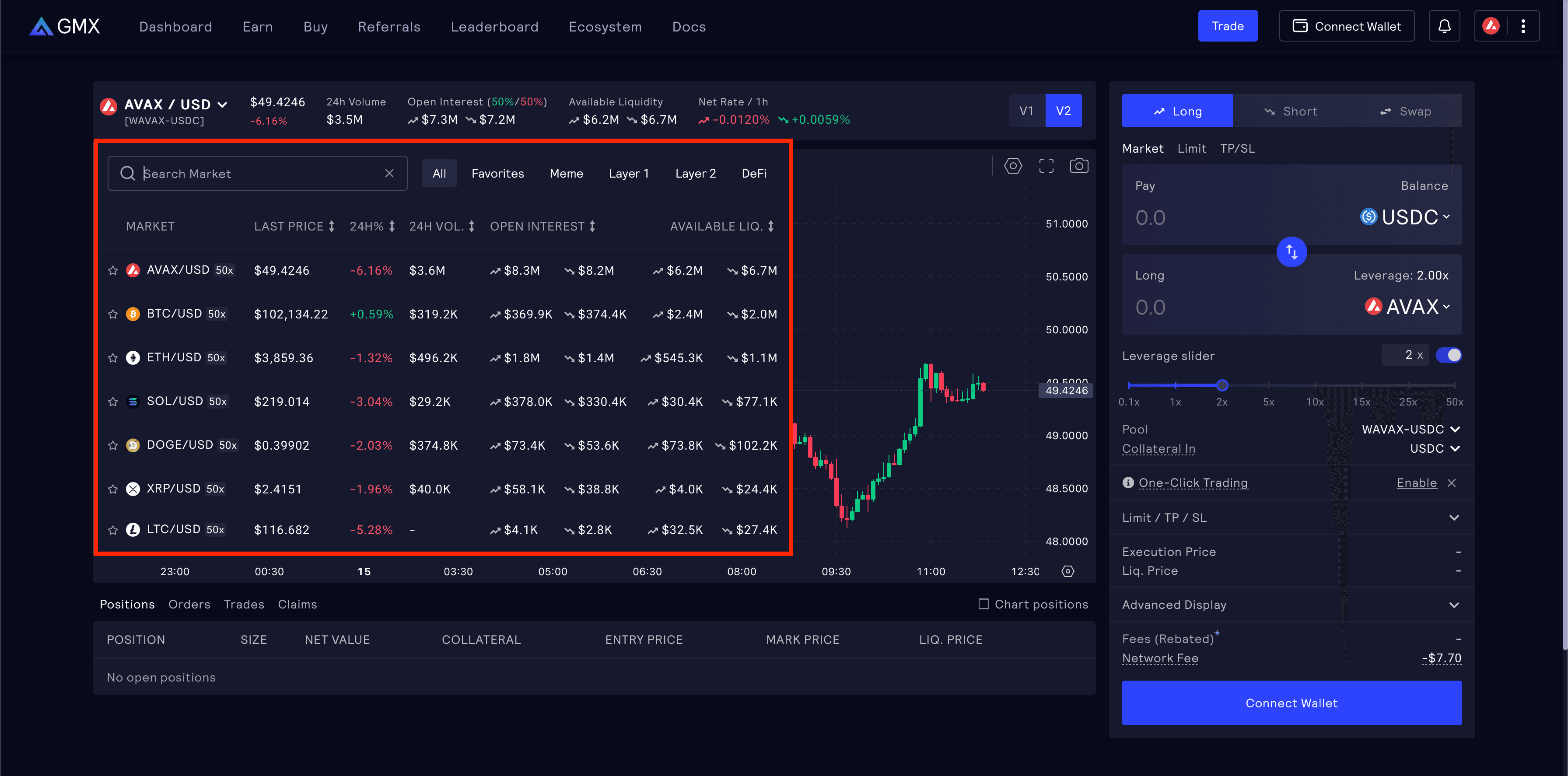 Selecting GMX V2 and connecting your wallet works like it does in V1. However, V2 improves on many of the features offered in V1, and introduces some new ones.