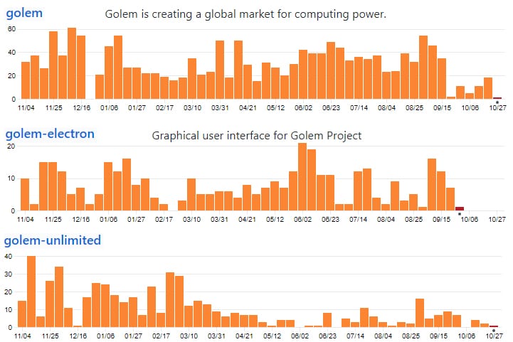 By diving into a projects public GitHub repository, we can get a good sense of this. Below are the code commits over the past year for the top three most active repos in the Golem GitHub.