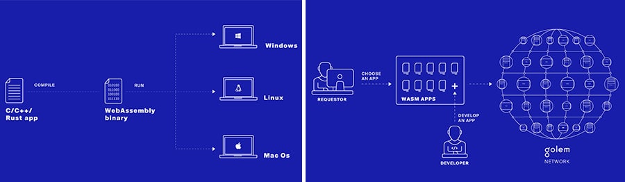 Standard WebAssembly and the Golem Wasm. Image Source: Golem BlogThis makes it easy to create new decentralized applications with a Web Assembly backend. It’s even possible to integrate existing applications by moving the computationally heavy and expensive part to Golem.