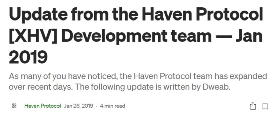 The Medium post announcing the community takeover of Haven Protocol. In January 2019, a few core members of the Haven community took over the project. They believe that the two anonymous founders had tried in good faith to deliver what they had promised. This was supposedly revealed in the original code the anonymous developers had left behind.