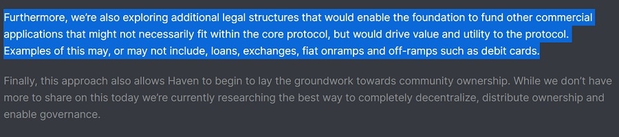 Haven Protocol’s blog post about announcing the Haven Foundation also seems to hint that they will be building payment tools such as cryptocurrency debit cards that will support XHV, xUSD, and other xAssets. It also hints that it aims to turn the project into a decentralized autonomous organization. Neither of these two are noted on their roadmap at the moment.