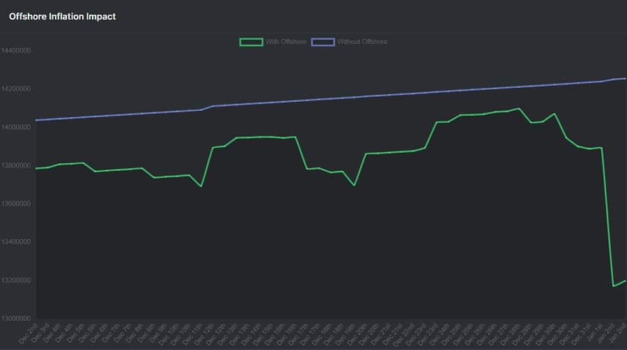 Although Haven Protocol’s tail emission technically makes it inflationary, the actual supply of XHV changes from day to day as people burn XHV to mint xUSD and vice versa. This means that XHV technically has two emission schedules/circulating supplies with Offshore (including xUSD and xAssets) and without Offshore (excluding xUSD and xAssets). These can be seen in the image above.