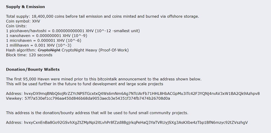 The original launch details for Haven Protocol. The impossibility of the task at hand in addition to the project having no private funding, no ICO, and only a small premine, resulted in a lot of traction for Haven Protocol when it launched. Unfortunately, the two anonymous developers soon realized that they could not accomplish what they had promised. They dumped their premined tokens on the market and abandoned the project at the end of 2018.