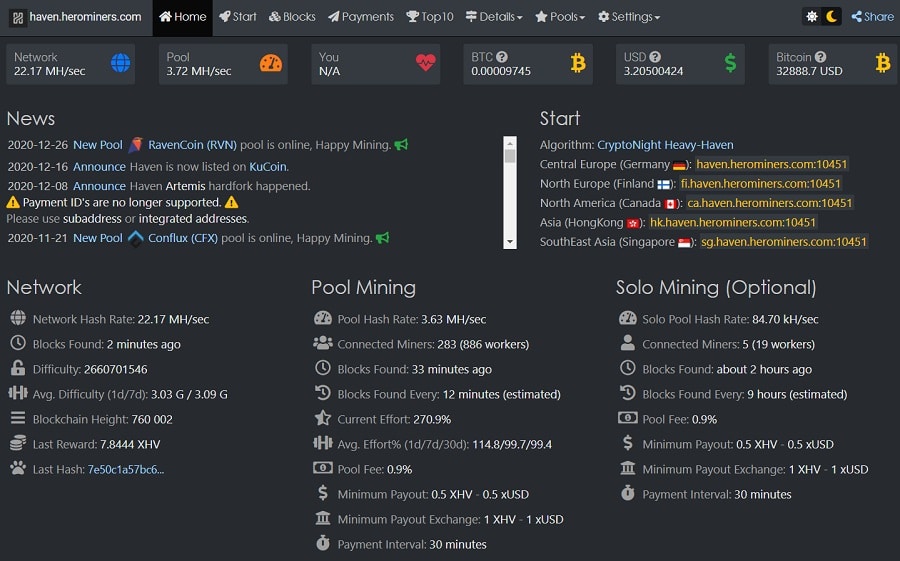 One of Haven Protocol's 5 mining pools. XHV is one of the most profitable cryptocurrencies to mine right now. The return on mining works out to about 1$ per day and this can be 2-3x higher if you have cheap electricity. If you are interested in mining XHV, you can do so by joining one of the five Haven Protocol mining pools. You can learn how to set up your Haven Protocol node by contacting the team via Discord or Telegram.